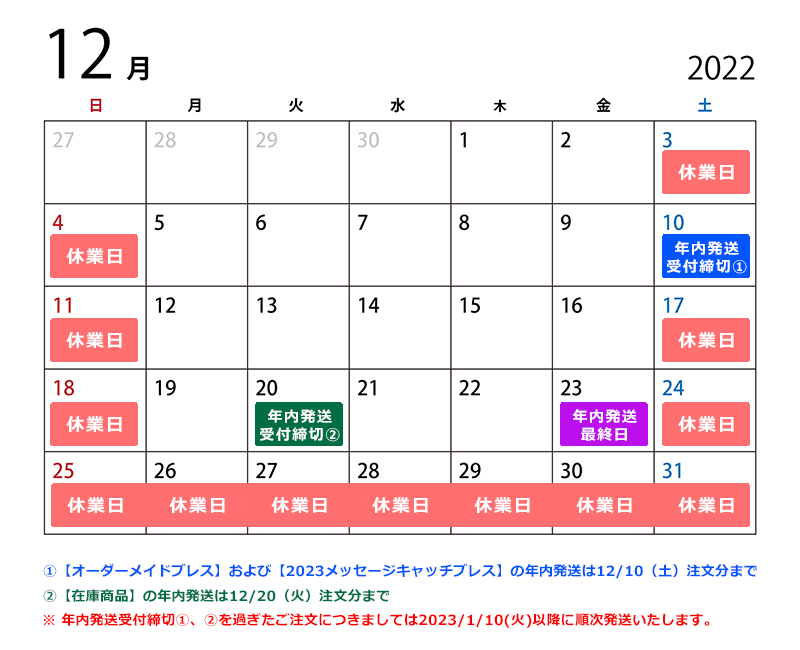 【年末年始の休業日について】各種ブレスレットの年内発送は12月10日(土)ご注文分まで【2022~2023年】